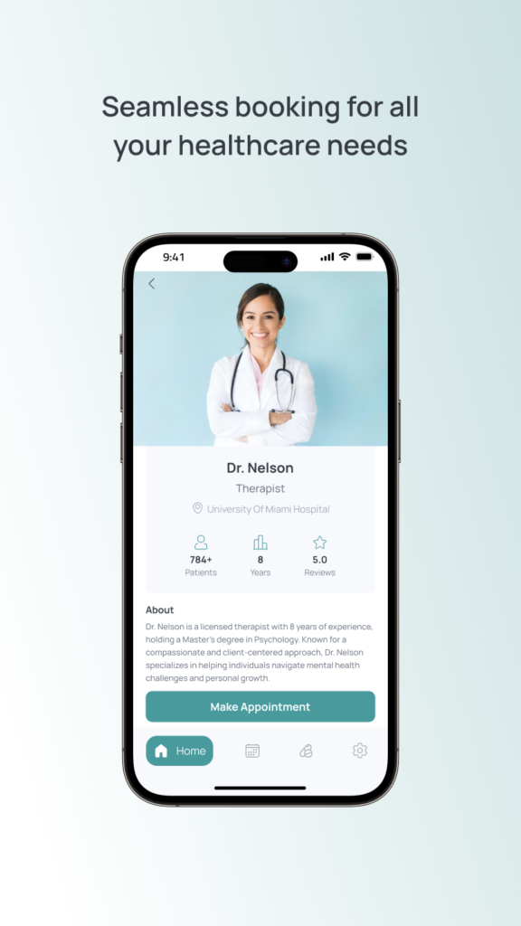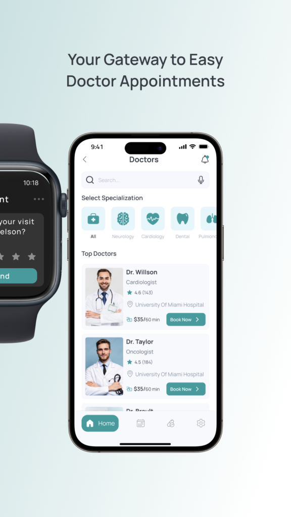• Doctor Search & Booking: find and book appointments with top-rated specialists.